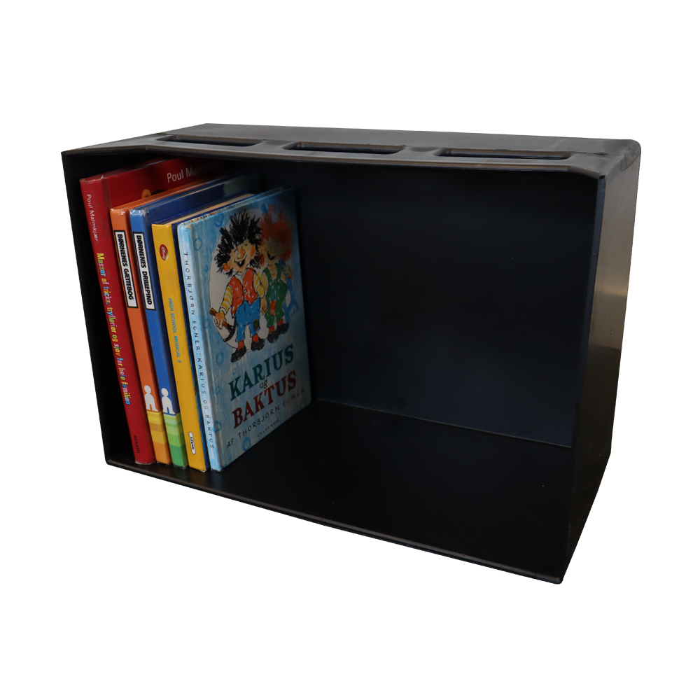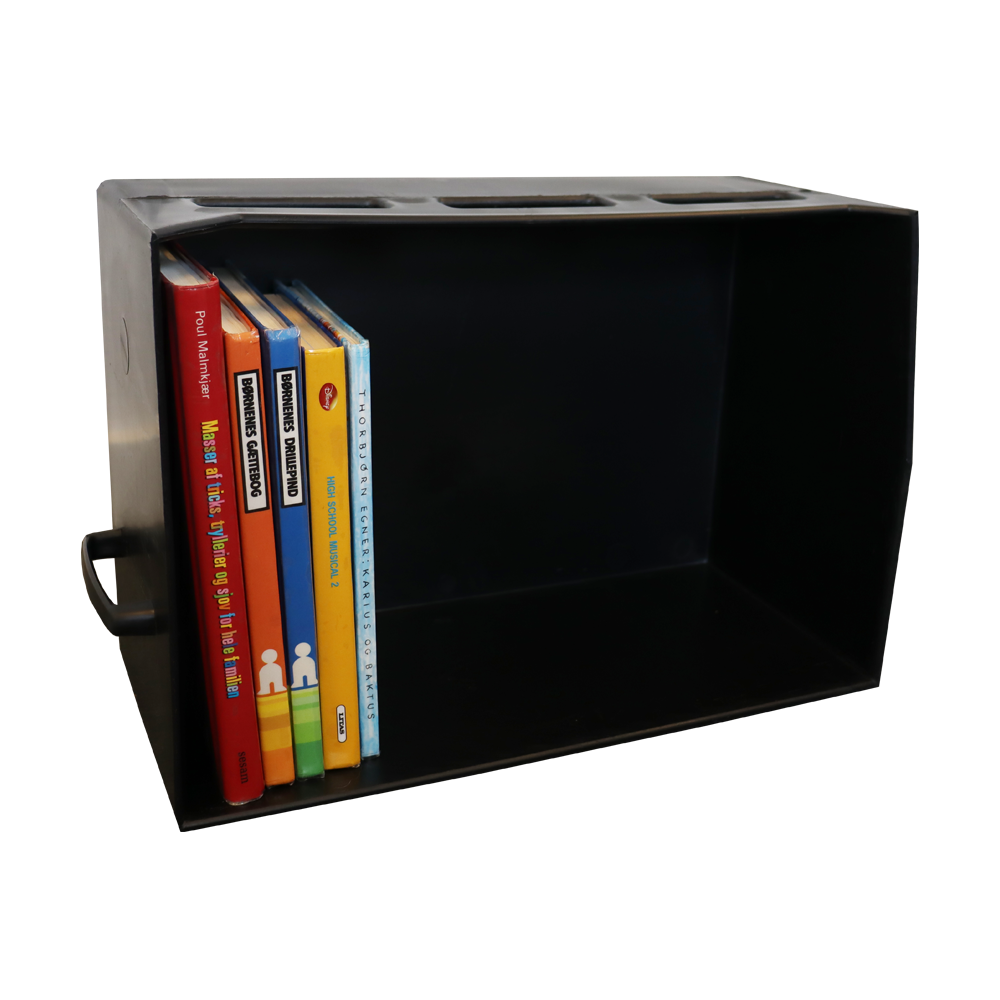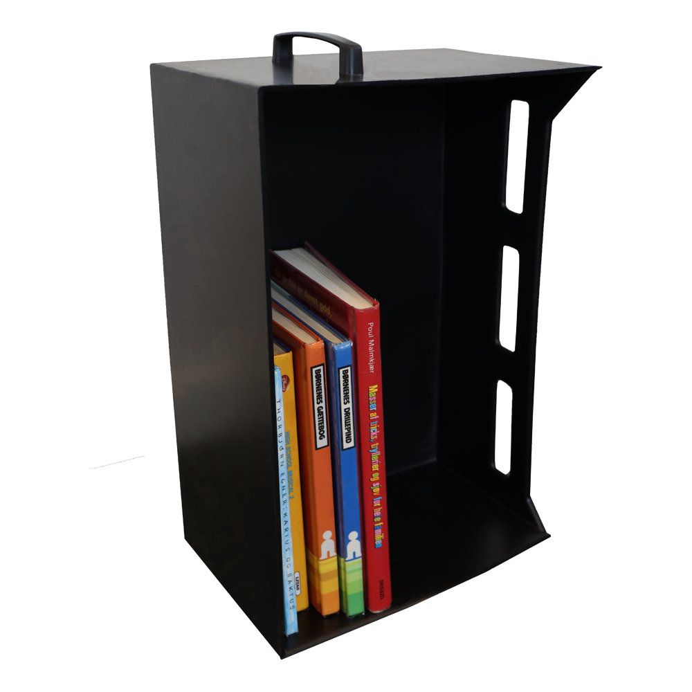 Solid bærekasse med håndtag til bøger og andre medier.