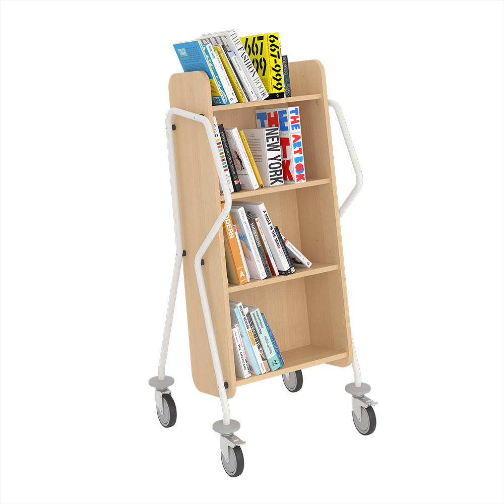 Ergonomisk, brugervenlig, enkeltsidet bogvogn med 4 hylder. Rigelig afstand mellem hylderne sikrer, at vognen også passer til bøger i større format.