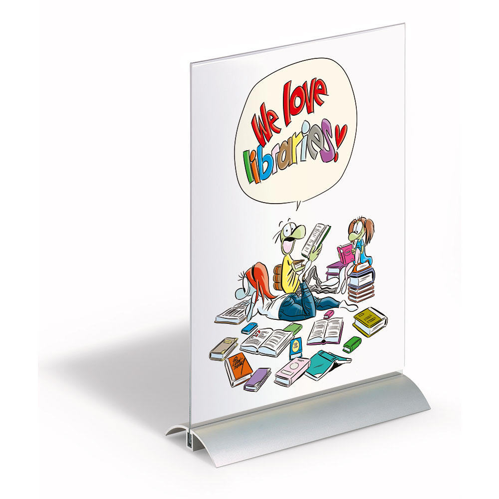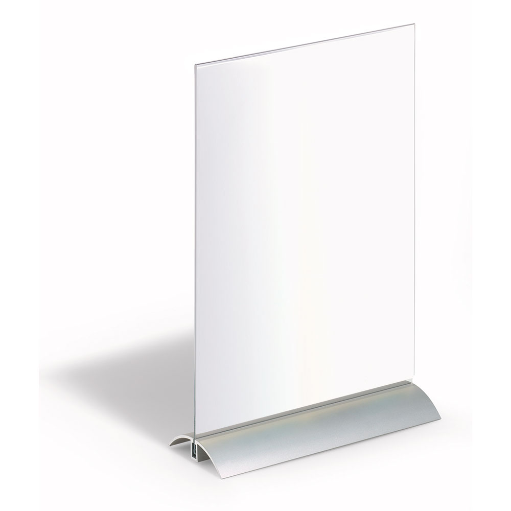 Eksklusiv dobbeltsidet skilteholder til bord, skranke, hylde, vinduer m.m.