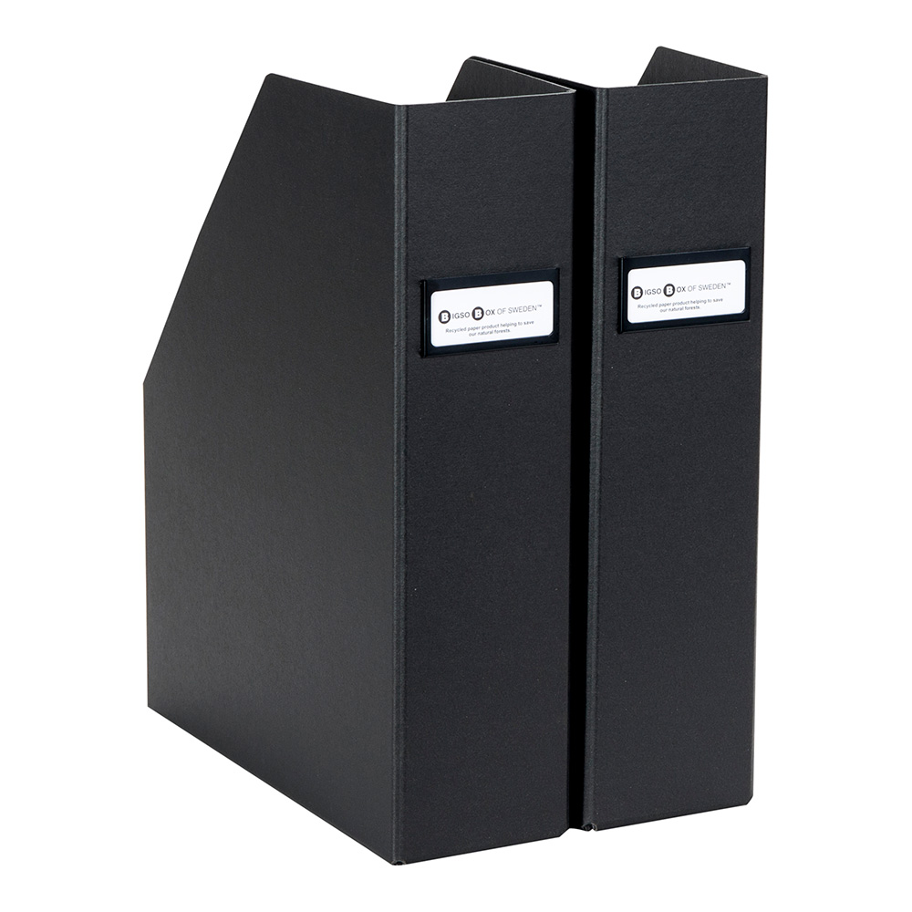 Tidsskriftsamlere med etiketteholder i metal på ryggen.