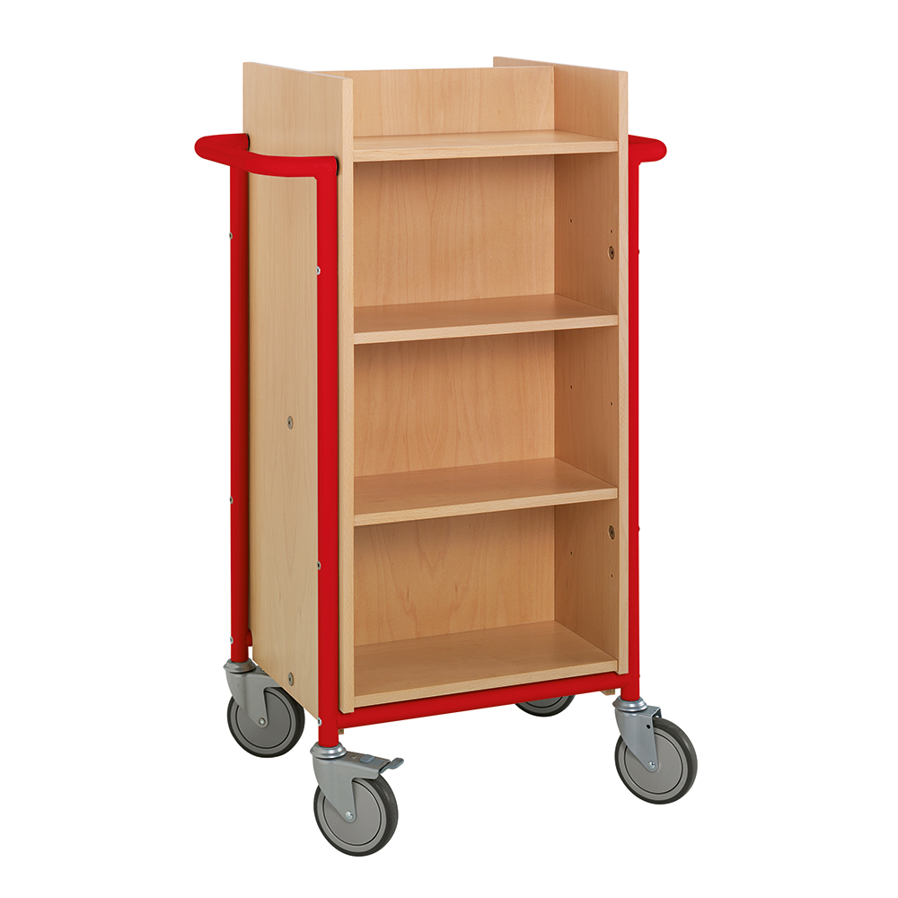Funktionel, dobbeltsidet bogvogn med 8 hylder. 6 hylder er flytbare til forskellige mediestørrelser.
