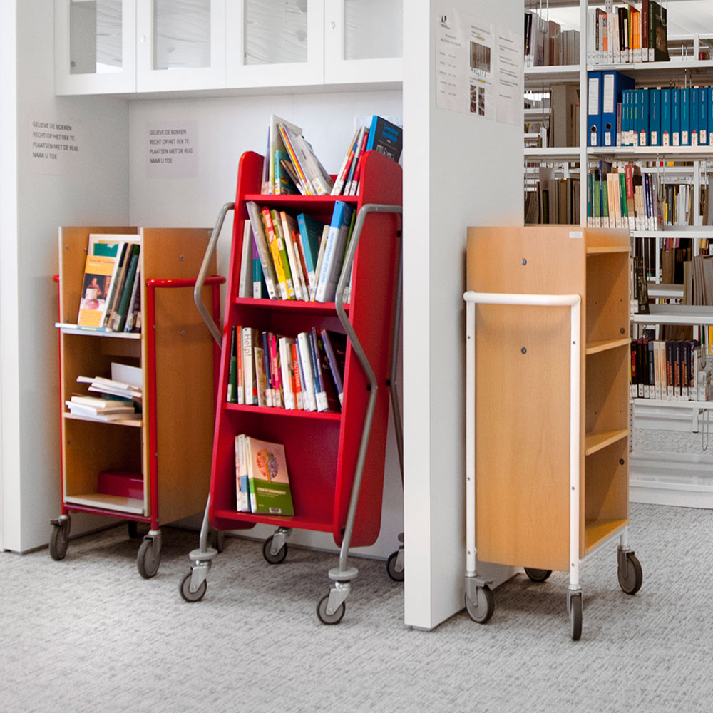 Denne bogvogn kan bruges som et mini reolsystem, der kan køres rundt i biblioteket efter behov.