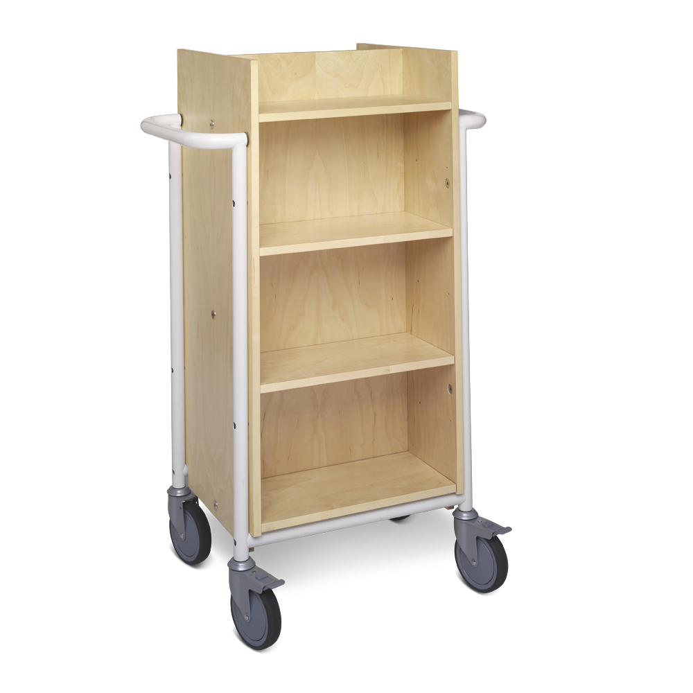 Funktionel, dobbeltsidet bogvogn med 8 hylder. 6 hylder er flytbare til forskellige mediestørrelser.