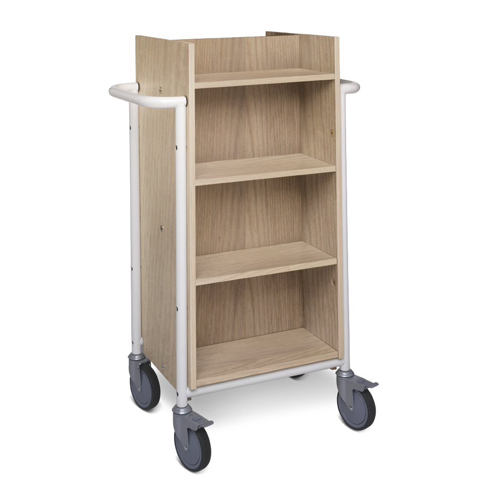 Funktionel, dobbeltsidet bogvogn med 8 hylder. 6 hylder er flytbare til forskellige mediestørrelser.