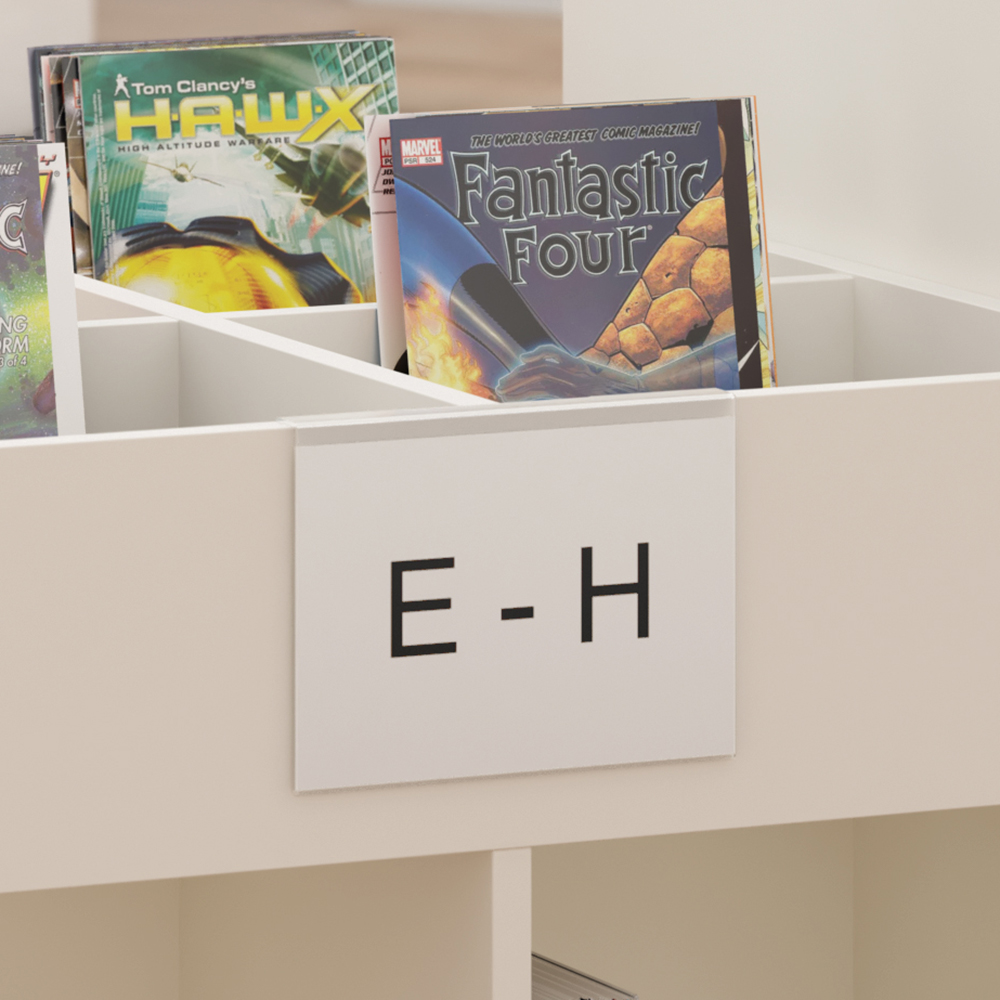 Refleksfri akrylskilt til f.eks. reolgavle (max 22 mm gavle) og krybber (max 20 mm gavle).