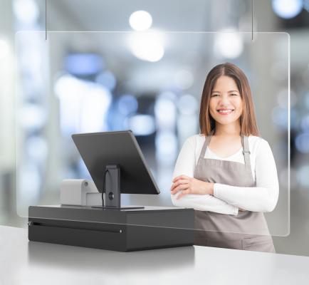 Hængende hygiejneskærm i elegant design og 3 mm tyk akryl med 2 x 2,5 m line til beskyttelse af dig og dine besøgende mod virus ifbm. en epidemi.