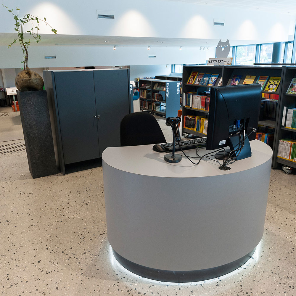 Smart, kompakt skranke i et stilrent og funktionelt design. Udstyret med LED-belysning (placeret under 'skørtet' foran). Perfekt som informationsskranke og arbejdsstation til større biblioteker eller receptionsskranke til skolebiblioteker.