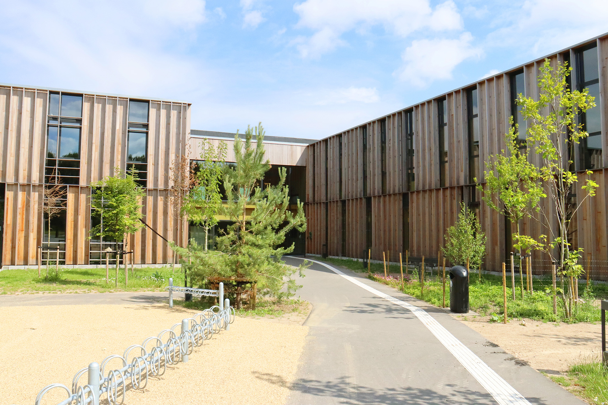 Vrå Børne- og Kulturhus er bygget på et grundprincip om bæredygtighed, hvor skolen bliver til skoven, og skoven bliver til skolen. Både inde og ude ses grønne arealer med læringsskove og træer, som smelter sammen til en smuk og bæredygtig enhed.