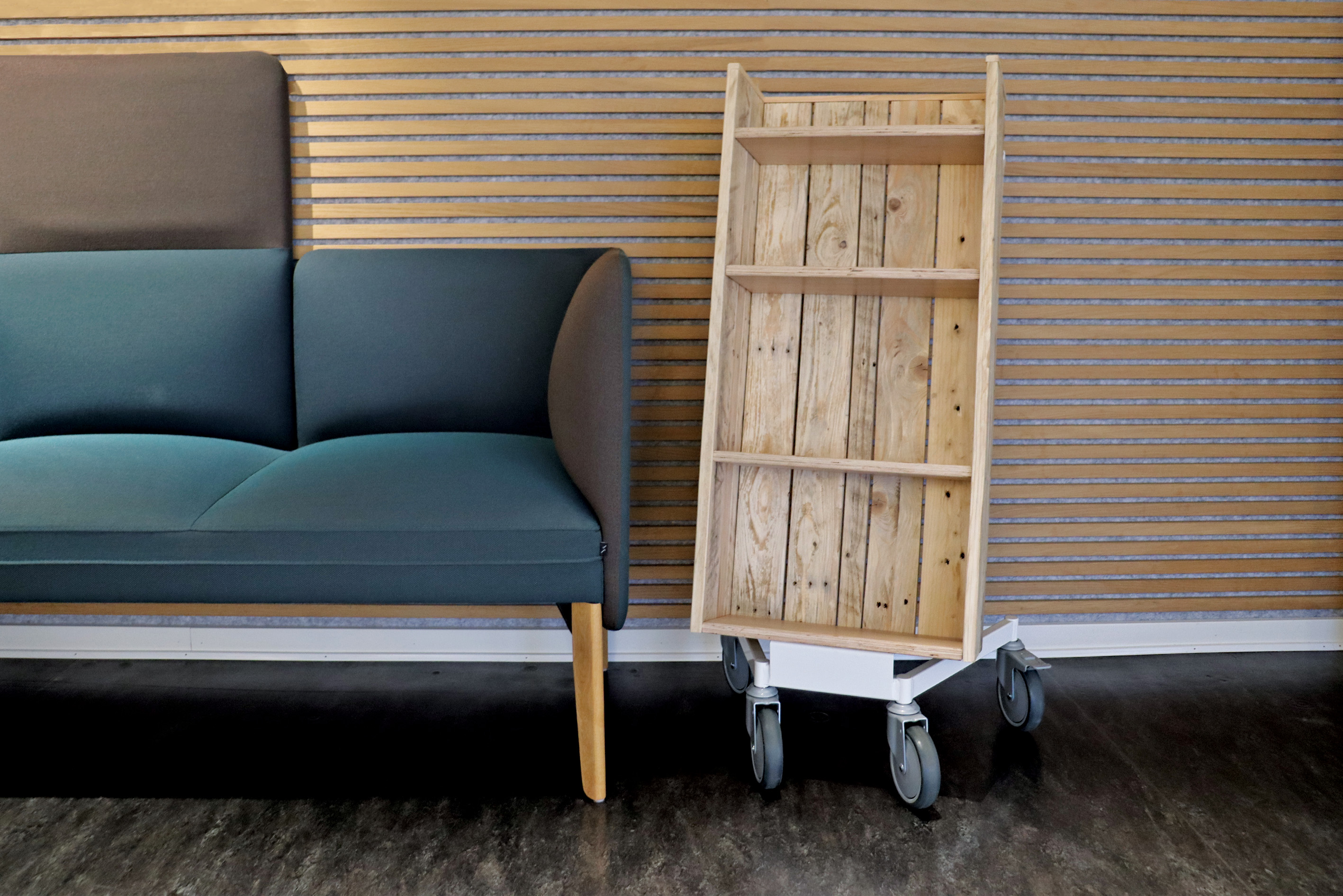 Hvert stykke træ bærer historien om dets tidligere liv, hvilket giver bogvognen en særlig karakter og tilføjer varme og et moderne touch til biblioteksindretningen.