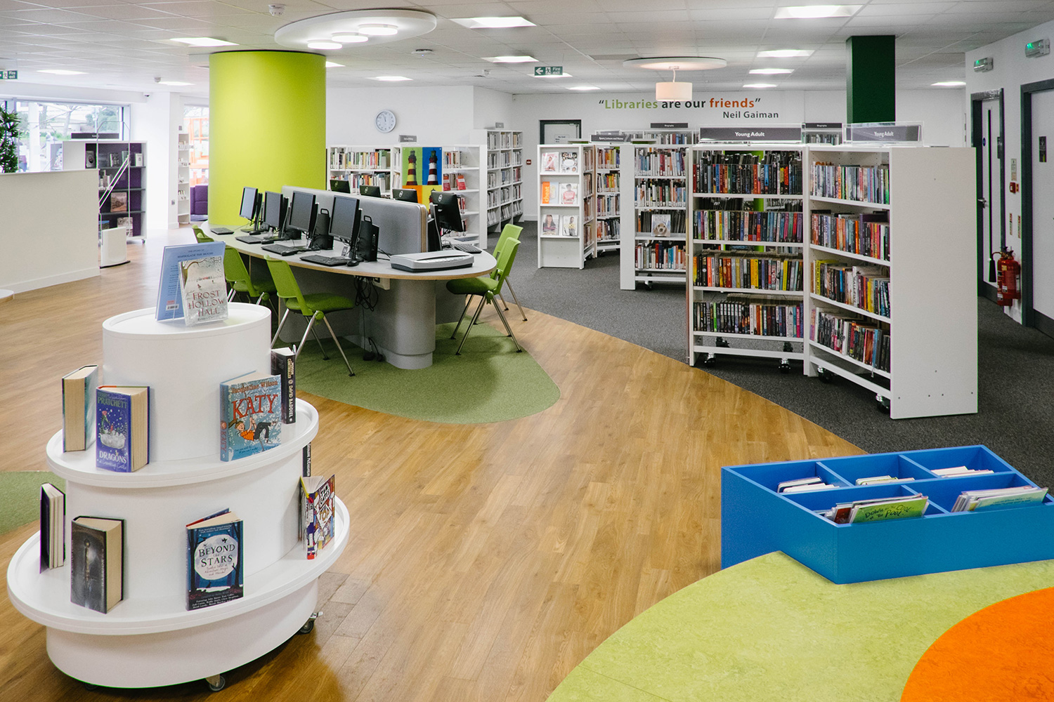 Specialdesignede akrylblade bliver brugt på træet til at sætte endnu mere farve på børnebiblioteket og de pulserende fyrtårnsgavle i akryl skaber et genkendeligt farvetema i stueetagen. Rundt om søjlerne er der monteret skræddersyede borde, som skaber et rummeligt computerområde. Væggrafikken ses gennem hele biblioteket og er med til at skabe liv.