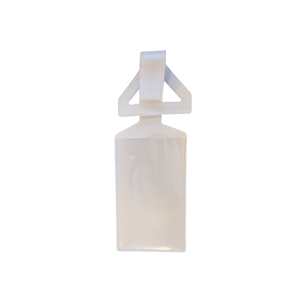 Kuffertmærke eller etiketholder med lille lomme som kan bruges til transportkasser, arkivkasser e.l. opmærkning.