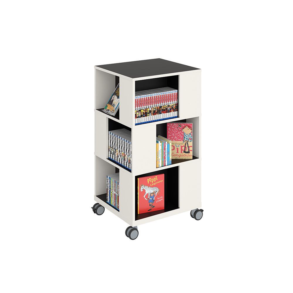 Fritstående, mobilt bogtårn. Stor kapacitet med 4 rum på hvert niveau.