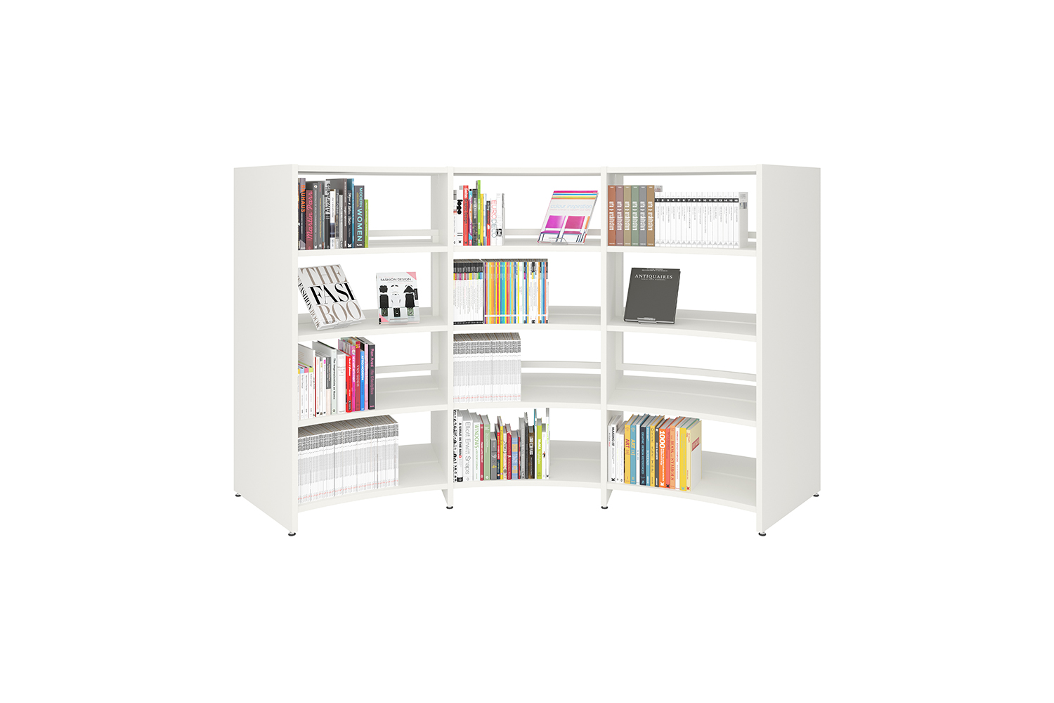 Den runde, dobbeltsidet reol er en videreudvikling af Lingo reolsystem. Lige og runde reolsystemer kan kombineres for at skabe forskellige opstillinger og landskaber i biblioteket.