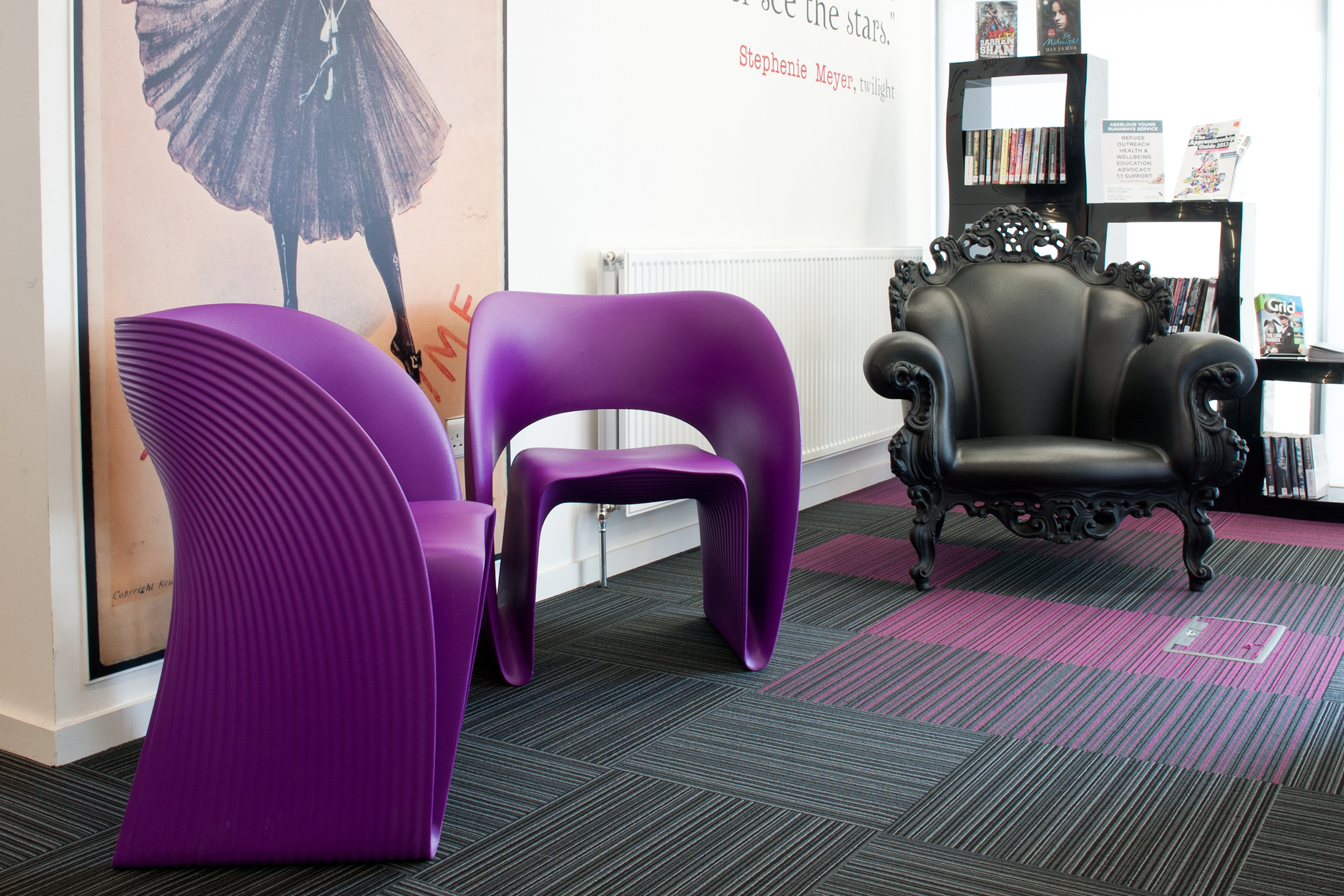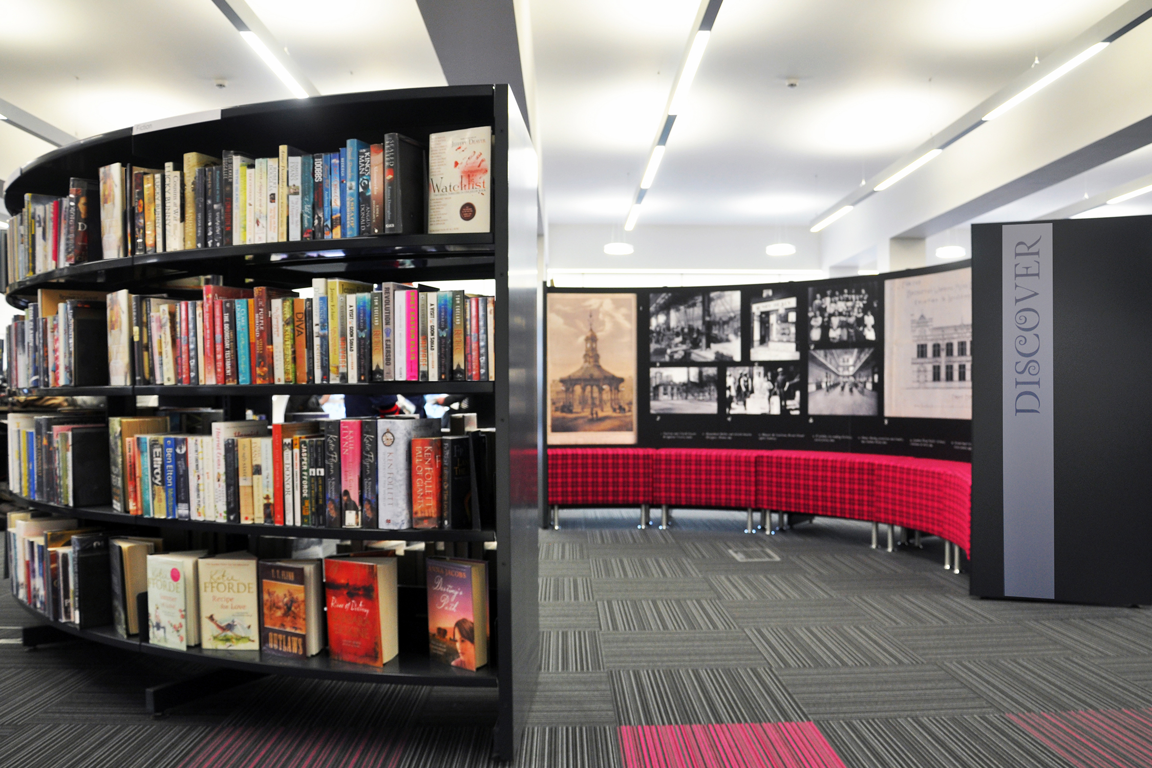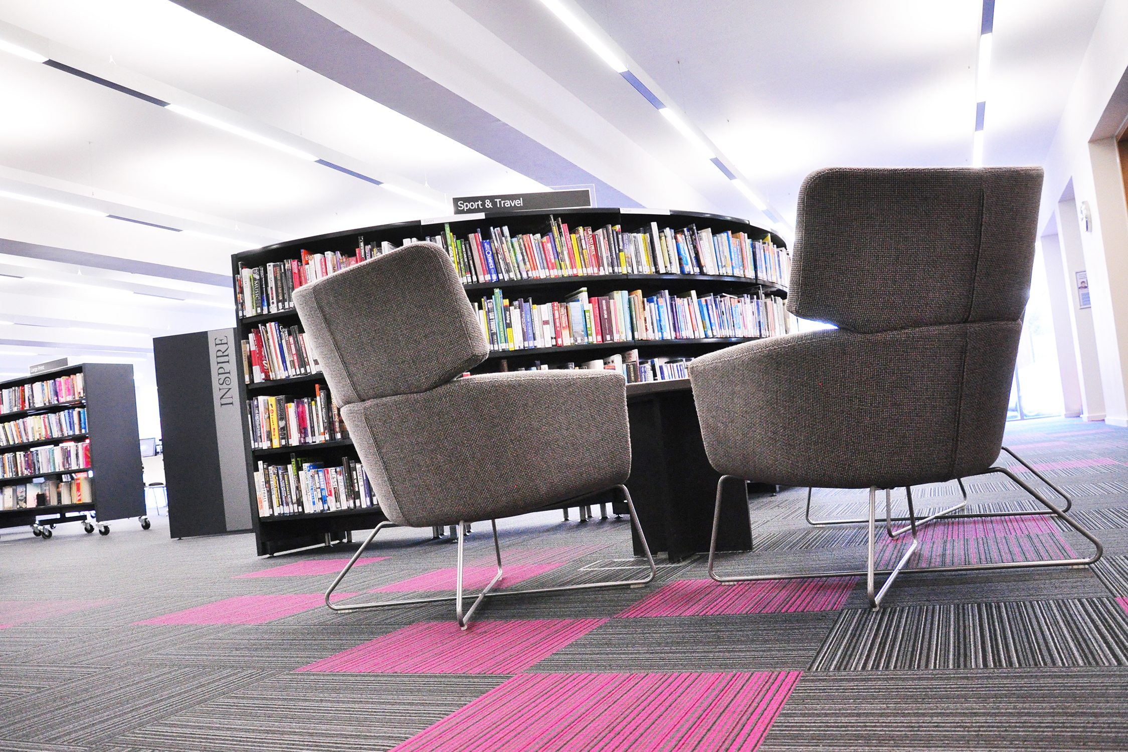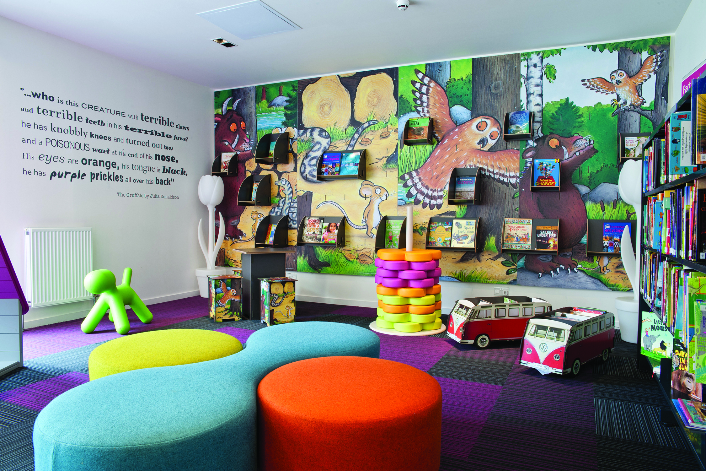 Hovedtemaerne og zonerne i biblioteket er styrket ved brug af grafik og skiltning, og med tilladelse af børneprismodtager Julia Donaldson brugte vi hendes populære Gruffalo billeder som væggrafik i børnesektionen og fortsatte dette tema hele vejen igennem til de skræddersyede minimøbler.