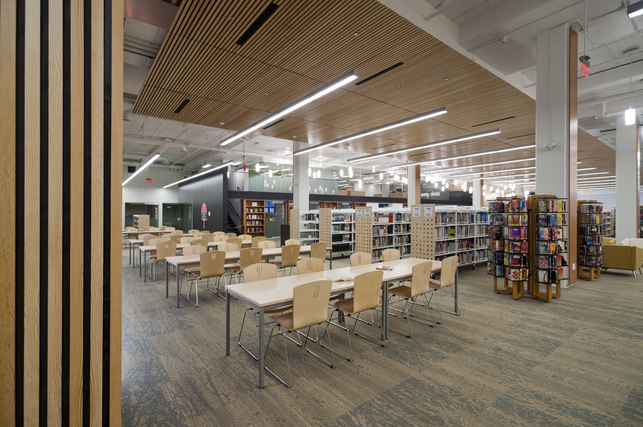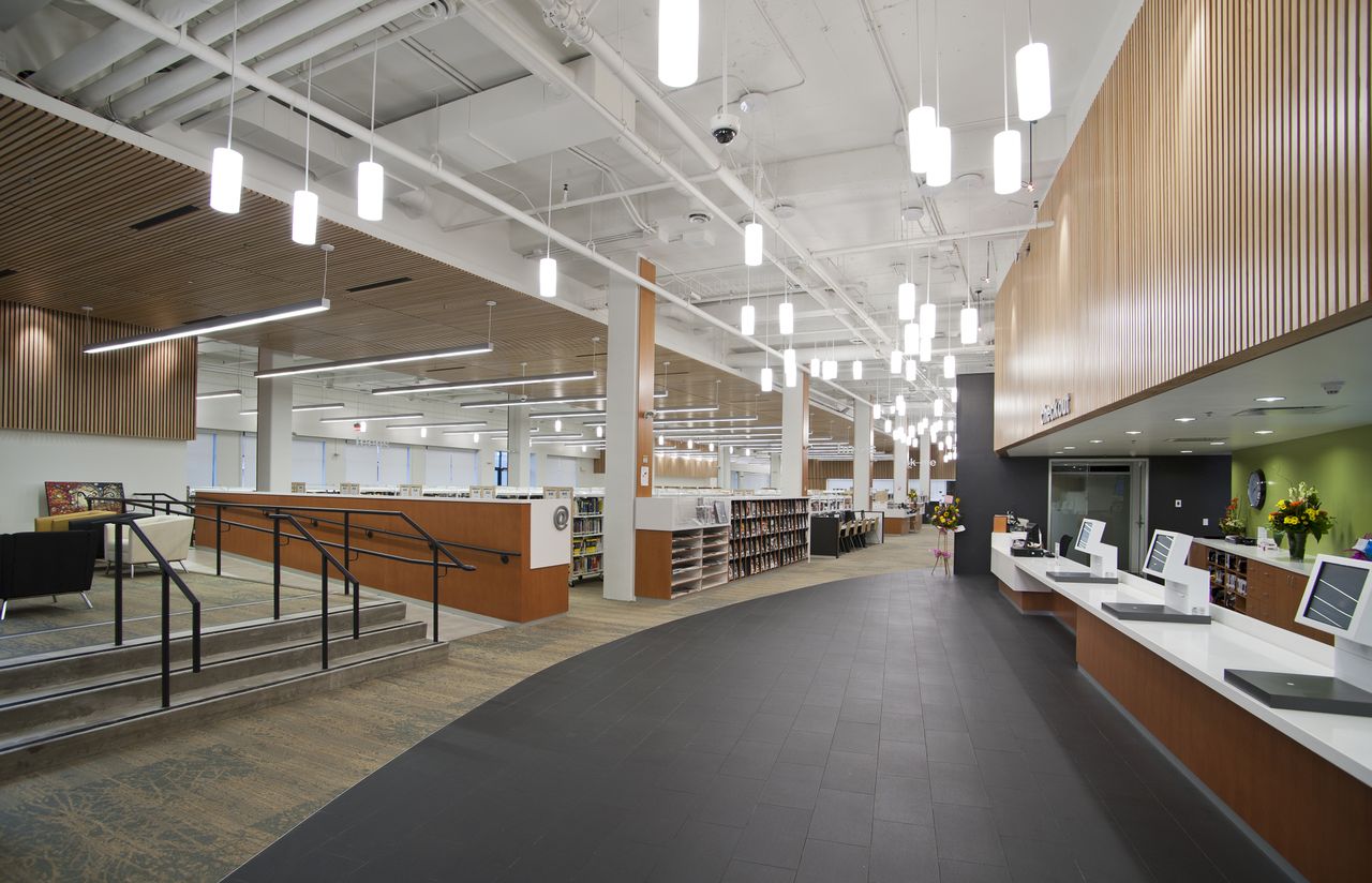 Dækkende over 2.973 m2 bruger indretningsløsningen den enorme plads til at levere flere bøger, mere plads til bevægelse og flere højteknologiske bekvemmeligheder. Resultatet er et bibliotek, som giver et varigt indtryk.