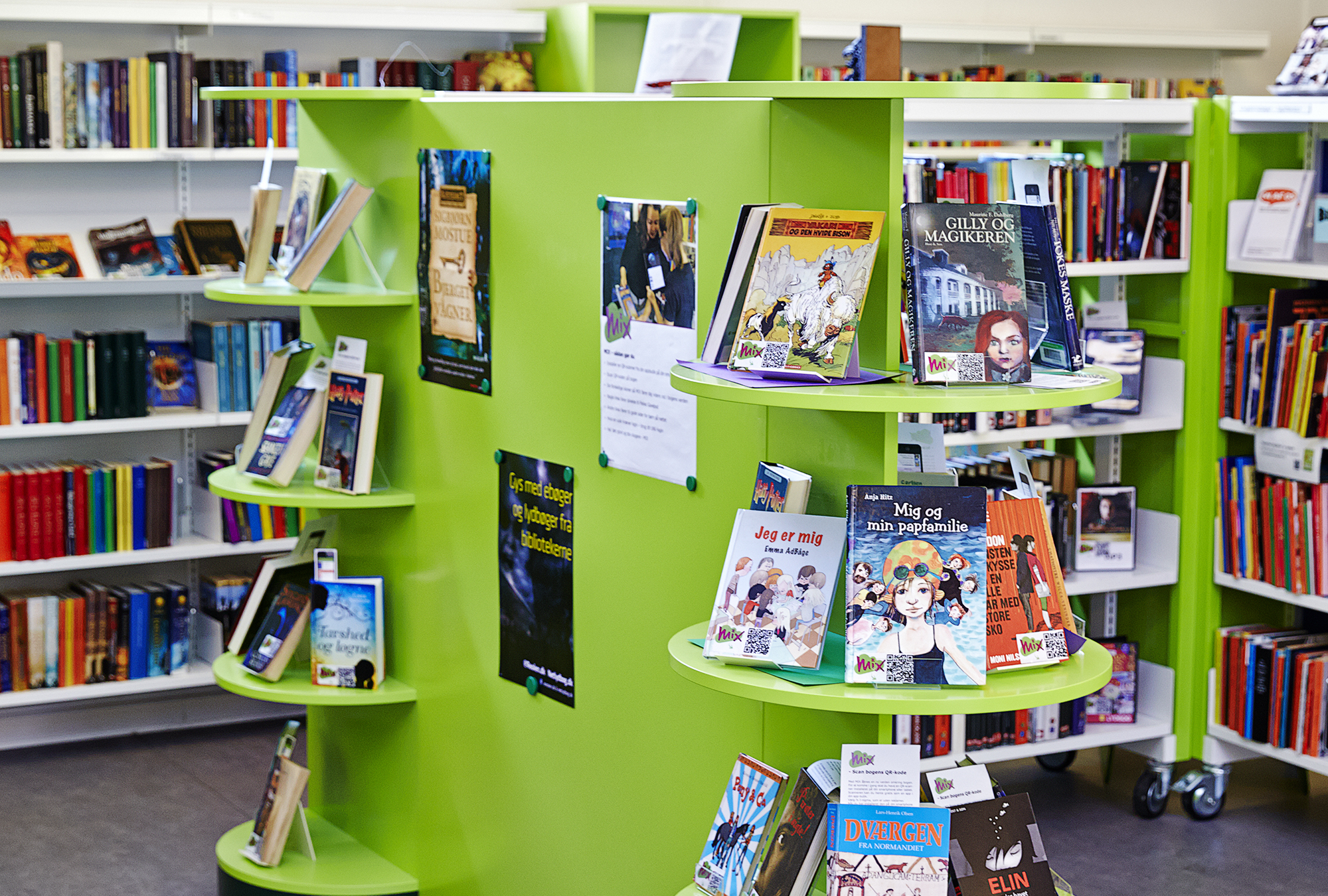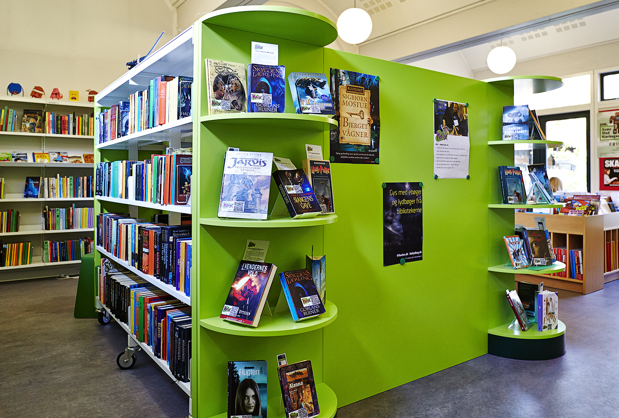 En del af børnebiblioteket ligger i det ældst daterede hus i Danmark. Opgaven for vores indretningsarkitekt Lykke Jørgin i forbindelse med en nyindretning af biblioteket har været at skabe en ny og mere tidssvarende zoneopdeling og få adskilt og understreget relevante funktioner og materialegrupper.