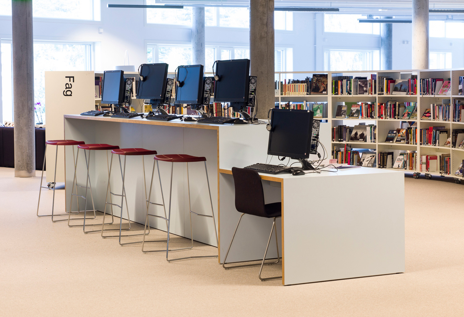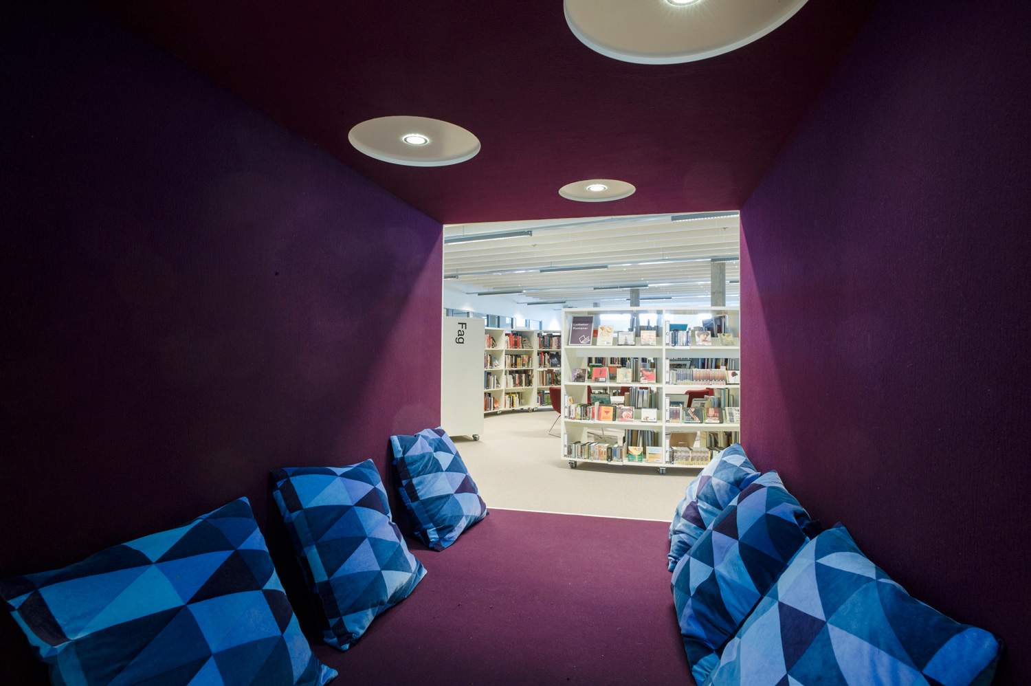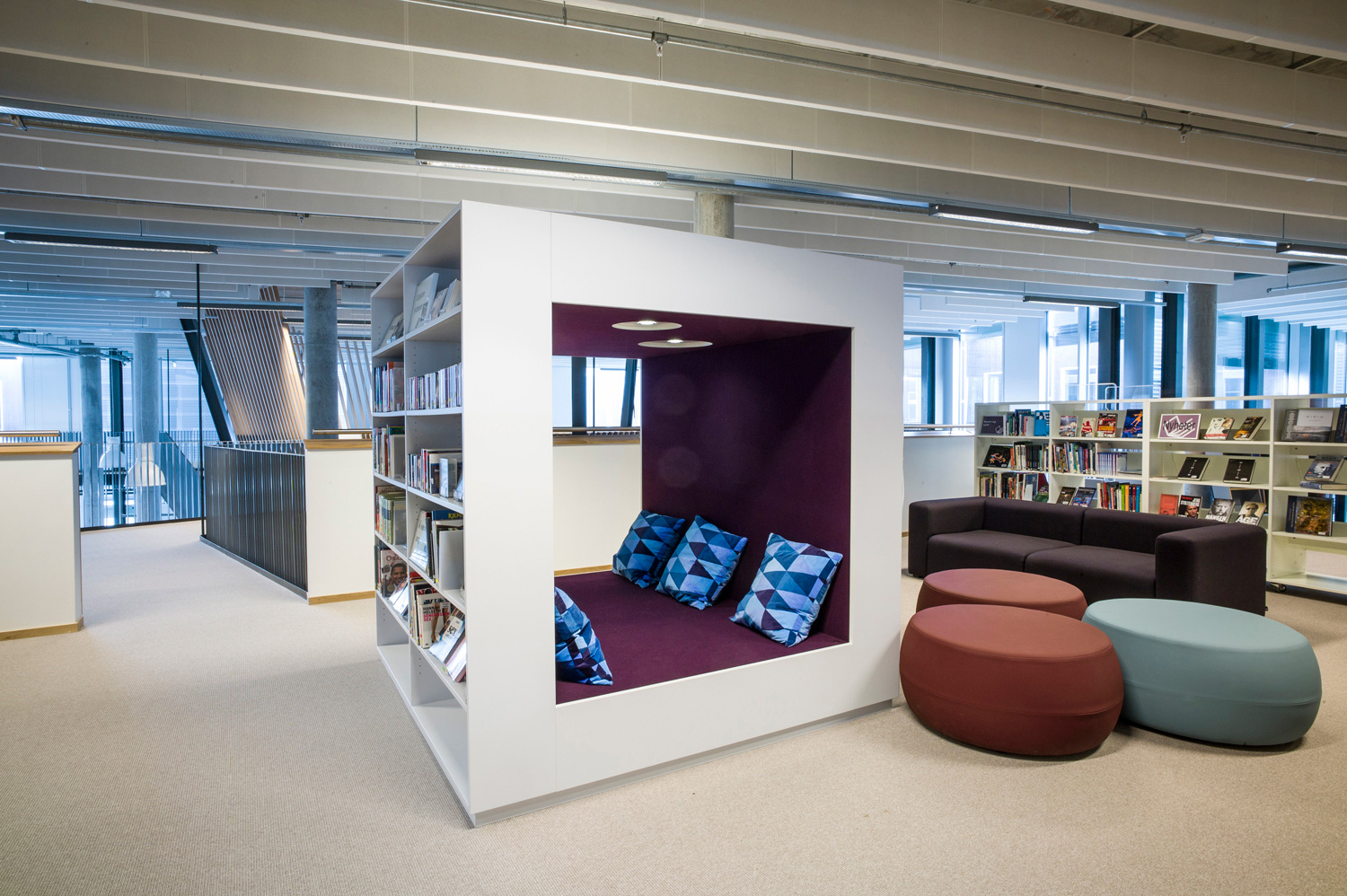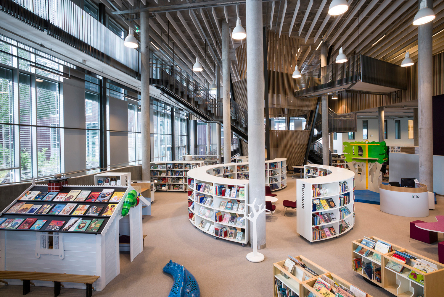 Med sine organiske former og bløde kurver viser dette bibliotek nytænkning. Det vises ikke kun i arkitekturen men også i reolsystemerne, der følger den organiske form. Der er masser af studieborde og behagelige siddepladser, informationsområder og selvbetjeningsskranker, som gør biblioteket rart at bruge.