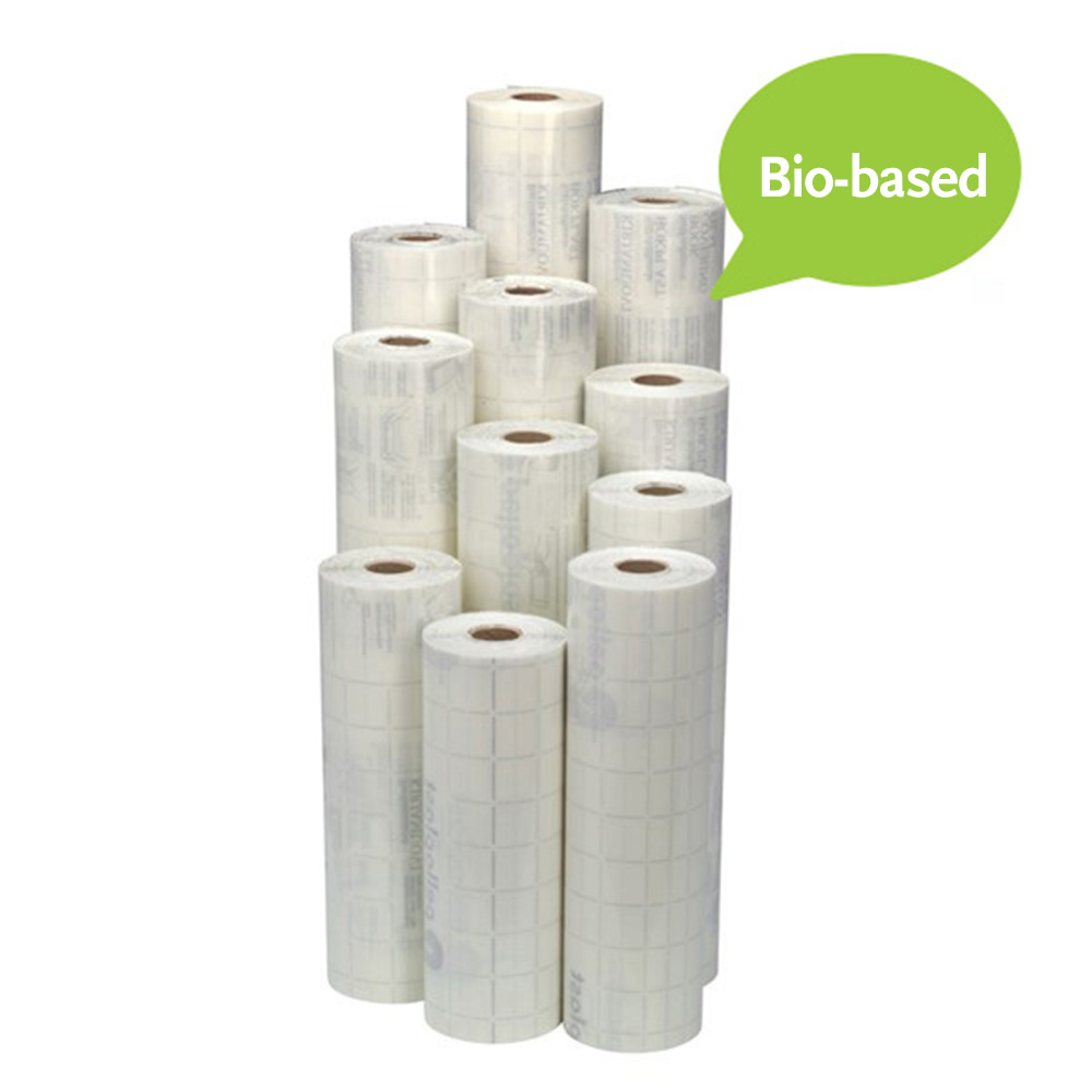 Den selvklæbende, blanke plastfilm er fremstillet af biobaseret plast (75% sukkerrør) og vandbaseret akrylklæbemiddel.