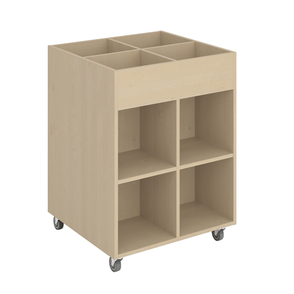 Sara Midi er en billedbogskrybbe med fire eksponeringsrum øverst og fire opbevaringsrum nederst. Ideel til børn.