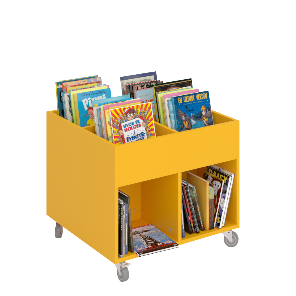 Sara Midi er en billedbogskrybbe med fire eksponeringsrum øverst og fire opbevaringsrum nederst. Ideel til børn.