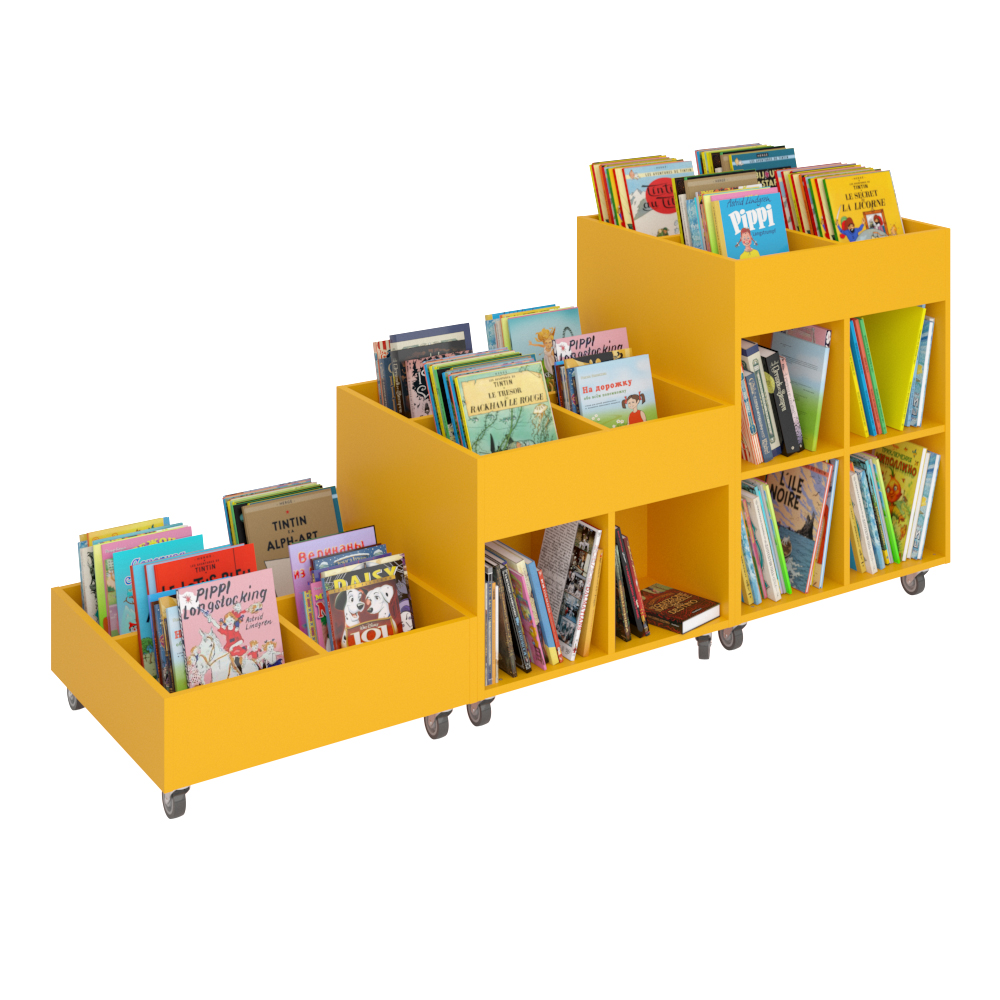 Sara er en serie af krybber i både kvadratisk og rund design og i 3 forskellige højder til fleksibel biblioteksindretning.