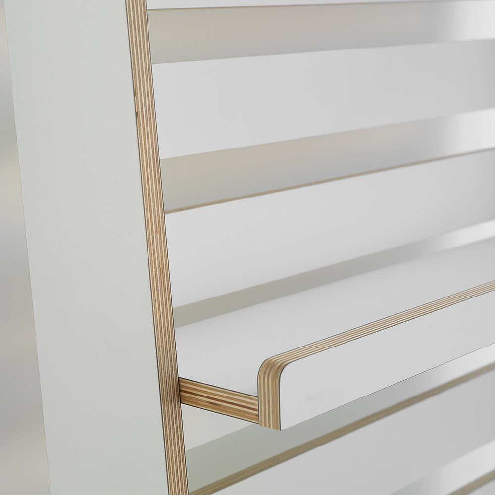 Er udstyret med 5 flytbare hylder med forkant (kan justeres noget i dybden). Skal placeres, så den læner sig op ad væggen (vægbeslag for sikker fastgørelse medfølger). Kan også anvendes fritstående ved at sætte to sektioner sammen mod hinanden.