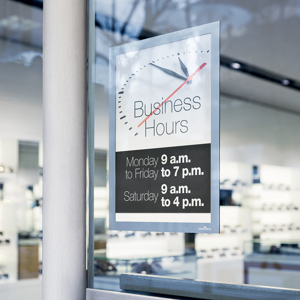 De statisk klæbende magnetiske rammer (Duraframe® Poster Sun) klæber statisk uden lim (uden risiko for at der dannes bobler). Ideel til markedsføring og information på større vinduer og glaspartier.