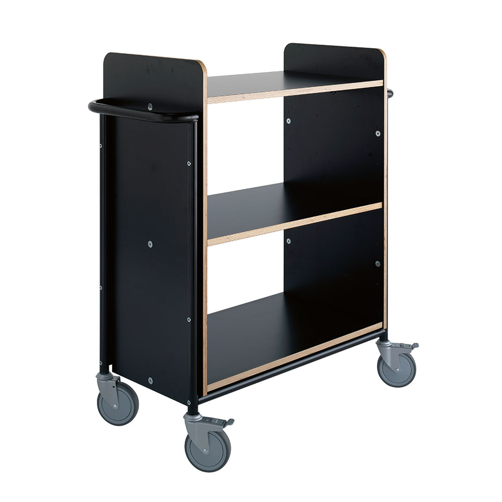 Dobbeltsidet bogvogn/transportvogn med stor volumen og 3 faste gennemgående hylder.