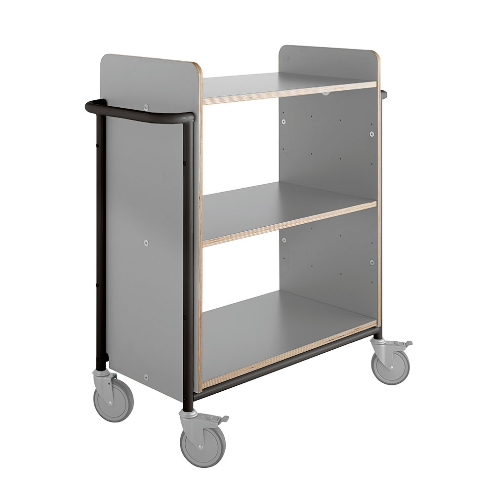 Dobbeltsidet bogvogn/transportvogn med stor volumen og 3 faste gennemgående hylder.