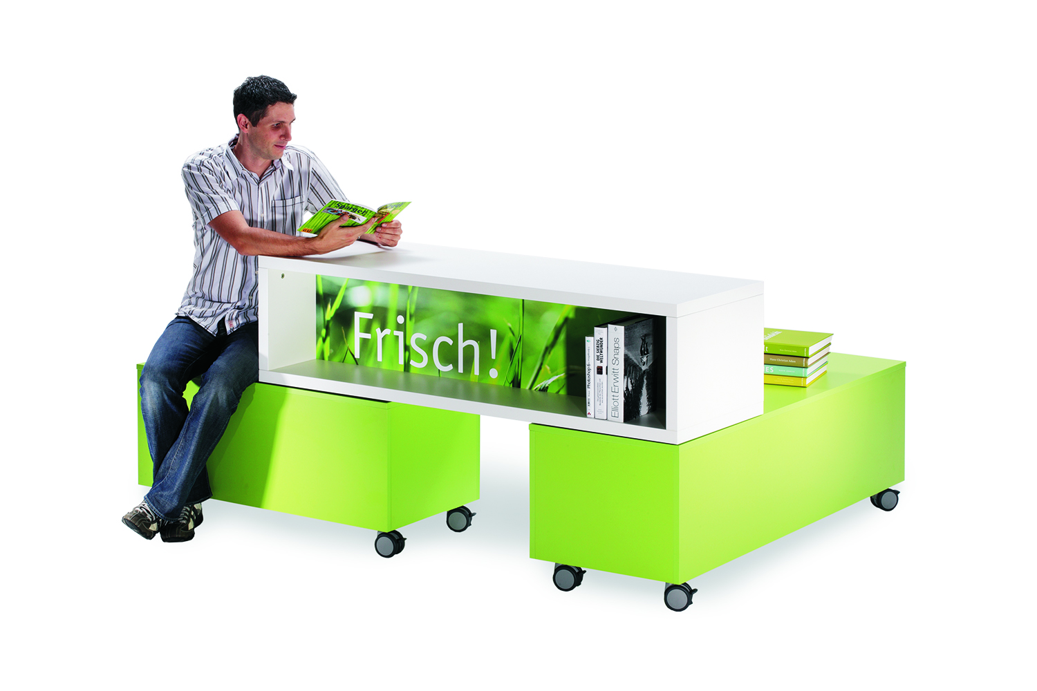 Et tre-delt mobilt system, der gennem et drejeled og en samlende ramme giver mange muligheder for udstilling og brug. Indersiden og frontdelene kan fås i kontrastfarver, og med supplerende grafik og/eller tekst kan dette møbel virkeligt fremhæves.